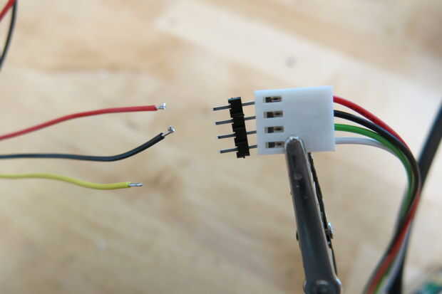 El láser tiene cuatro cables conectados a él pero sólo necesita usar 3 control rojo, blanco y negro. Utilizar un encabezado de 4 pines macho de easer para clip de entrada y salida. Sólo el rojo y negro a los correspondientes puntos de la cabecera de la soldadura saltar un pin y pin amarillo pasado de la cabecera de la soldadura.