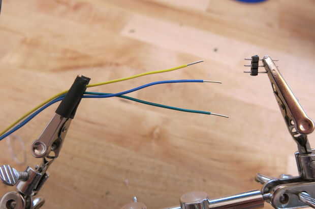 Soldadura a su último jefe del 3 pin en el orden: amarillo - azul - verde. Esto va a hacer fácil para que usted sólo tiene que enchufar sus acordes en el protoboard.