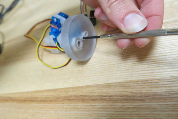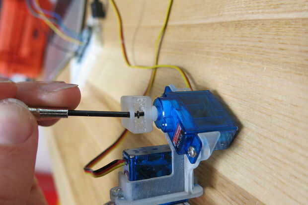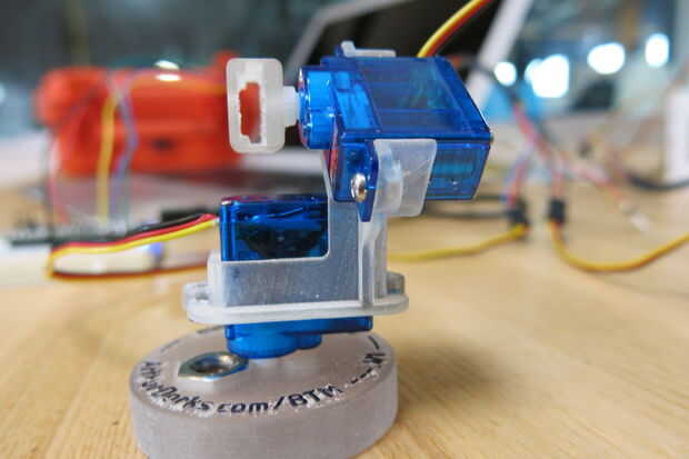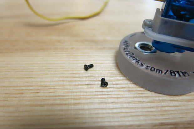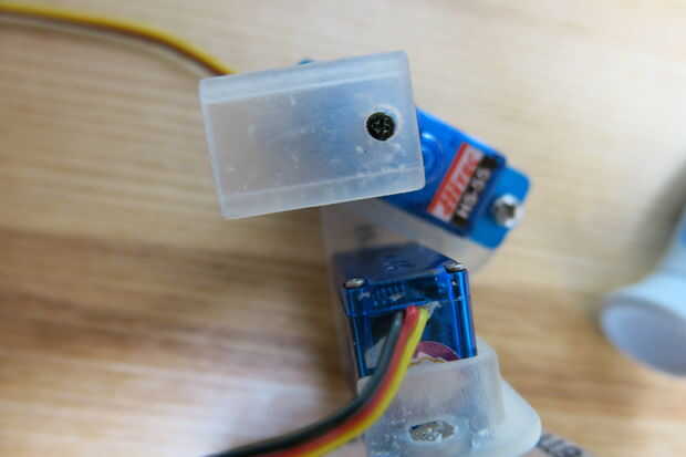 Sin mover los cabezales servo, coloque con cuidado el soporte base y láser en su lugar. Uso los pequeño tornillos que se salvó de los cuernos de servo para atornillar en su lugar. Asegurarse de que no hay poder correr cuando hace esto, podría romper sus servos.