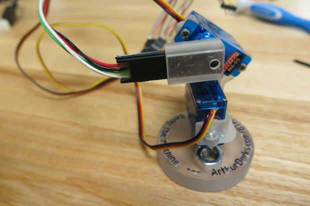 El láser en el soporte del laser y vuelva a conectar los cables. Recuerde negro-rojo-azul va al servo cerca de la base, negro-rojo-verde va al servo por el Monte. Línea de los cables rojo y negro sobre el láser con los cables rojo y negro de la cabecera.