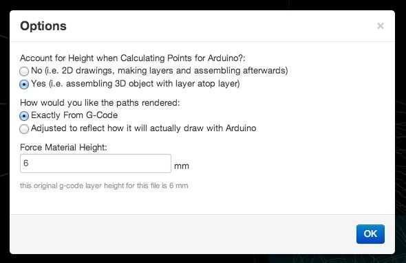 Utilice el panel de opciones para establecer parámetros personalizados. Se puede especificar si va a crear en 3D (haciendo un modelo) o 2D (hacer un dibujo). Esta opción cambiará la forma de que los ángulos para el servo se calculan desde modelos 3D cambiará la altura y representará el punto láser y 2D modelos tendrá una altura constante.