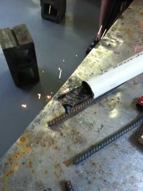 Para este ejercicio, todo lo que necesita es unos pocos clavos arriba y abajo de la manija para ajustar el ángulo, más algunos granos pequeños en los extremos para mantener la PVC en el lugar. (Oh, usted también tendrá a un tío cool que tiene el equipo para disparar saetas del relámpago mágico con relativa exactitud.)