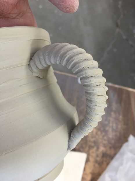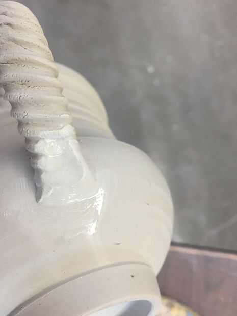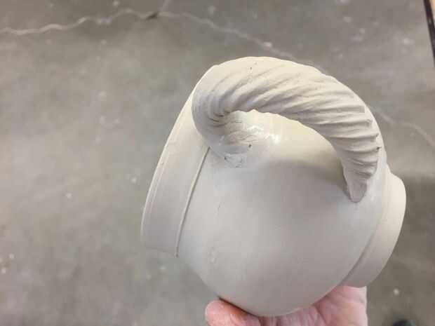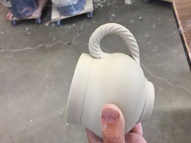 Sujete la parte superior y luego la parte inferior del mango a la taza. Mirar desde el lado y hacer ajustes a la forma de una manera que más le convenga. Añadir unas gotas de agua para alisar todo el los dos puntos para la fuerza y evitar asperezas.