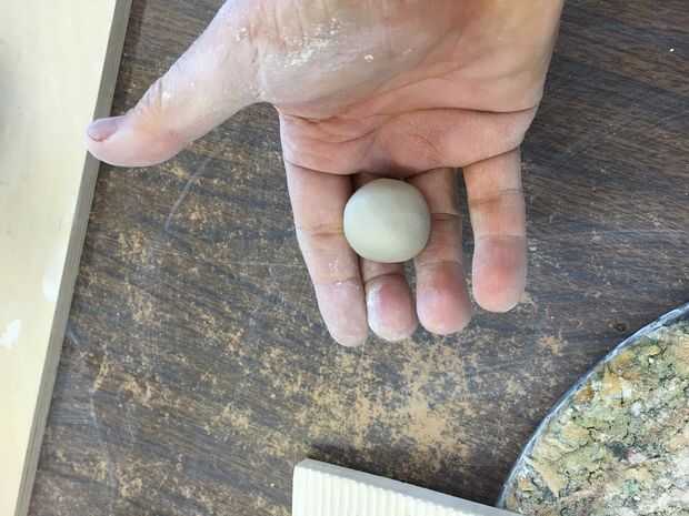 Tomar un trozo de arcilla, como se ve en la foto y rodar en una bola en forma de huevo. Asegúrese de que está comprimido suficiente por lo que no hay burbujas de aire en la arcilla.