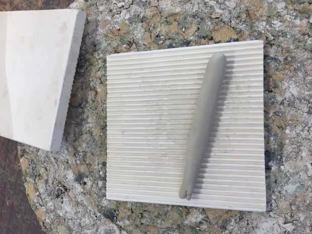 Coloque el cilindro sobre el azulejo en la posición que quieras. Diferentes orientaciones de cada azulejo hará diversos patrones emergen. Hay cuatro patrones básicos (lo siento no tengo fotos de todos ellos), una espiral, rayas y dos tipos de entrecruzados.