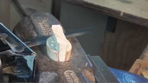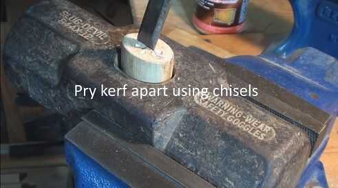 1. hacer tres a cuatro pulgadas de diámetro profundo corte en la parte superior de su bloque usando una sierra circular o motosierra.2 con el filo de su hacha hacia arriba medir el ancho del mango del hacha. Con un lápiz, tiza o texta marcar esta med