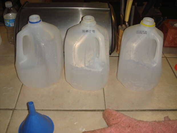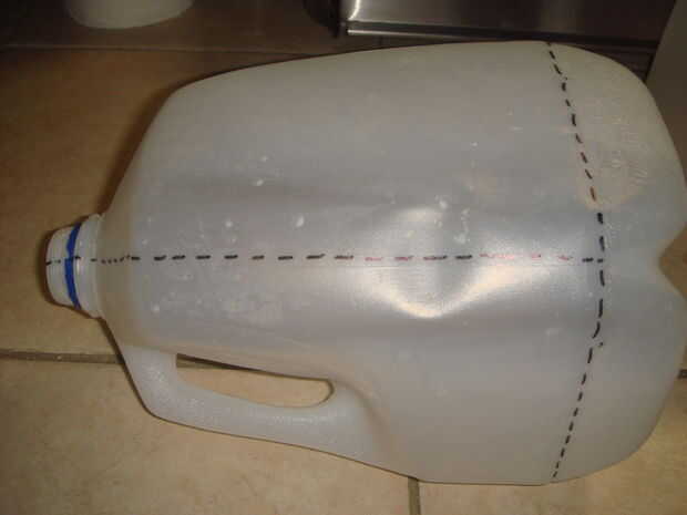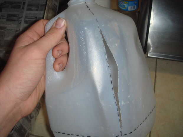 Cortar sus jarras de leche en quintas partes a lo largo de las costuras. Cortar a lo largo de una costura lateral y corte la parte inferior a lo largo de la costura. Entonces mirando hacia abajo el pico cortado en cuartos. Una corte debe ir a la derecha por la mitad del mango. Hacer esto a todos tus jarras de leche.
