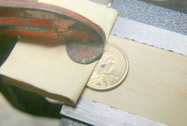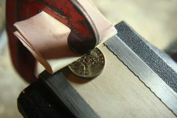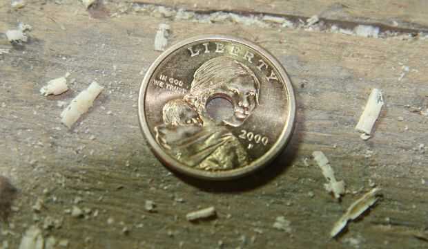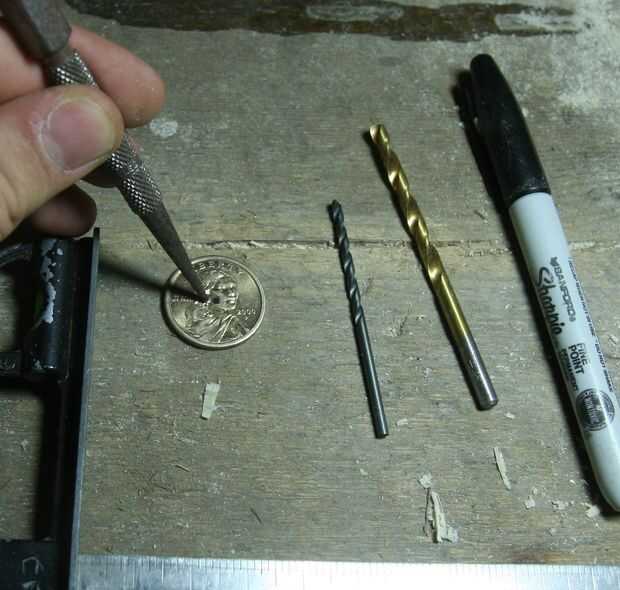 Primero marque el centro de la moneda y luego utiliza el taladro para perforar una mella.