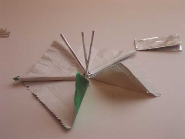 Son los palos que has usado para hacer los conectores debe estar en cada uno de los 3 conectores laminados. Necesita formar el centro de la sombrilla que conecta el mango con la parte superior. Vamos a utilizar estos palillos que sirven como las espinas con la parte superior vertical para hacer esa conexión. La mitad de la longitud de cada vara se utilizará para la columna vertebral, otro para la conexión al mango.