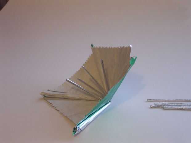 Tire de cada palo del centro de la sombrilla, asegurándose de que el palillo sale sólo a mitad de camino. También, asegúrese de que el palo está en el lado de papel (parte inferior) de los contenedores que forman la parte superior. Doblar cada uno de los tres 3 palillos hacia arriba en ese punto medio en cada palillo. Coloque las piezas verticales de los palos tan juntos como sea posible en el centro exacto de la parte inferior de la sombrilla.