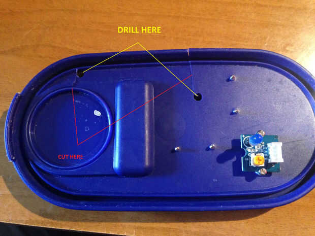Hacer otros dos agujeros en la parte posterior de la caja, uno para el cable de alimentación y uno para los cables del sensor. Para una fácil conexión de los cables, hacer dos cortes desde el borde de los agujeros.