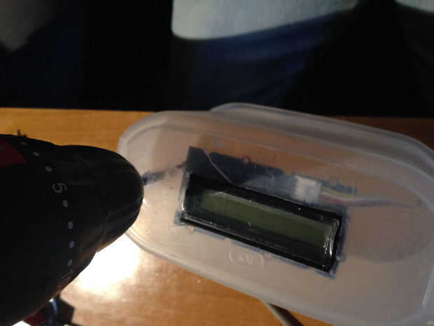 Con un taladro hacer tres agujeros. Primero una en el lado derecho de la pantalla LCD y su diámetro debe ser 6-7 mm para el tamaño del sensor de ángulo rotativo.