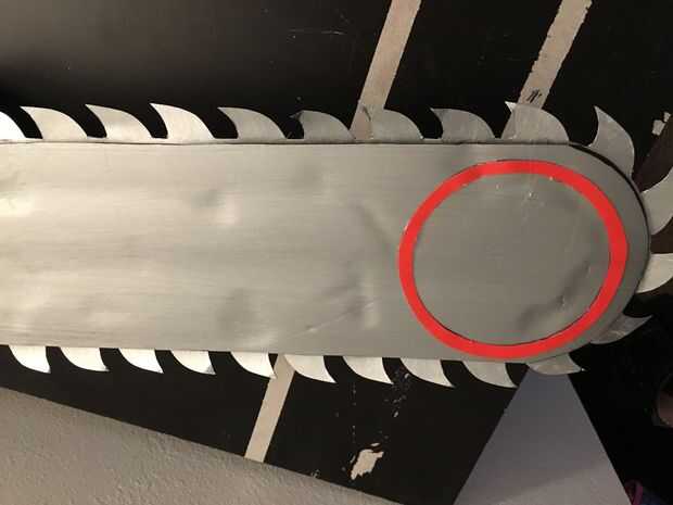 La hoja de motosierra fue realmente mi parte favorita de la construcción y lo que estaba buscando hacia adelante para la mayoría. Que utiliza el tablero de la espuma para las grandes piezas de la hoja (no los dientes de la motosierra. Corté 2 piezas del mismo tamaño exacto y dimensiones. hice las 2 piezas principales tiempo suficiente para salir de 24" de la caja principal e ir dentro de la longitud de la caja. Tan aproximadamente 36" en total dependiendo de la caja de usa. Esto era para soporte estructural.