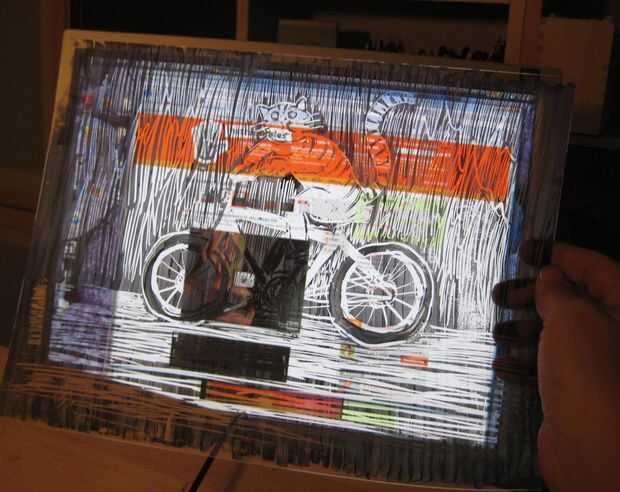 Utilizar a algún tipo de herramienta embotada rayar su diseño sobre la misma. Utilicé el lado equivocado de un pincel, pero se puede utilizar casi cualquier cosa. También he tenido éxito utilizando una goma de borrar para quitar la tinta de borrado en seco. También funciona una herramienta de modelado de arcilla.