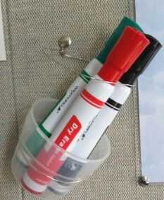 Puede guardar los marcadores en un cajón cercano, pero quería un derecho contenedor junto al tablero. Así tomó un vaso de plástico pequeño y envuelto el borde con el alambre (debe ser de alambre grueso. Yo usé calibre 20.). Entonces, después de retirar la Copa, usa los extremos del cable para formar un bucle pequeño que un alfiler podría pasar a través para que pudiera pin la copa para arriba junto al tablero de borrado seco. Si la taza no tiene altura suficiente para que los marcadores se sientan cómodamente sin salir, hacer dos lazos y prender un lazo por encima de la taza para sostener las plumas constante. Añadir los marcadores y, finalmente, voilà: un tablero barato y fácil, con marcadores de cerca para su comodidad, para su placer de la organización.
