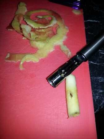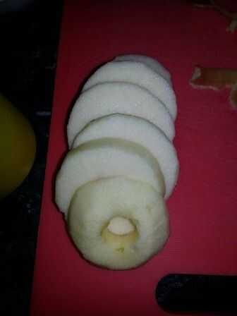 Tomar su apple sano agradable, utilicé una manzana Pink Lady, pelar, eliminar de la base y rebanar en aros o rodajas. Trate de no hacer las rodajas o anillos muy gruesos. Yo diría que alrededor de 3mm a 4mm de espesor.