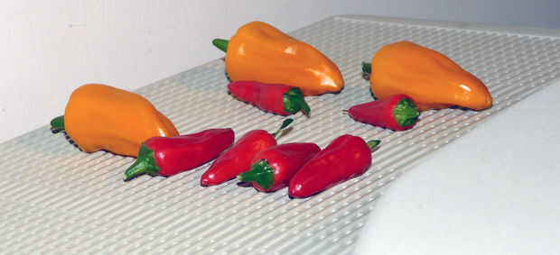 Deje suficiente espacio para el aire circular libremente entre los chiles. No tiene ningún sentido poner chiles en áreas plástico en aire no sale el dispositivo, también intenta evitar bloquear las aberturas de ventilación completamente. Es probablemente mejor secar los chiles unos en un tiempo más bien que acumulando 2 kg encima de un dispositivo y sobrecalentamiento.