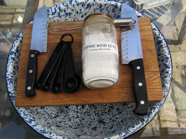 Grado de alimentos ácido cítrico a 1 cucharadita por galón de agua o jugo de limón a Tablespons 3-4 por galón de agua para remojar. Esto evitará que los chips de oscurecimiento durante el secado y almacenamiento.