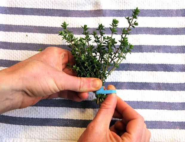 Recoger el sus hierbas juntos, todas las bases pellizcos juntos. Envuelve una banda elástica alrededor de las bases para mantener las hierbas juntos.