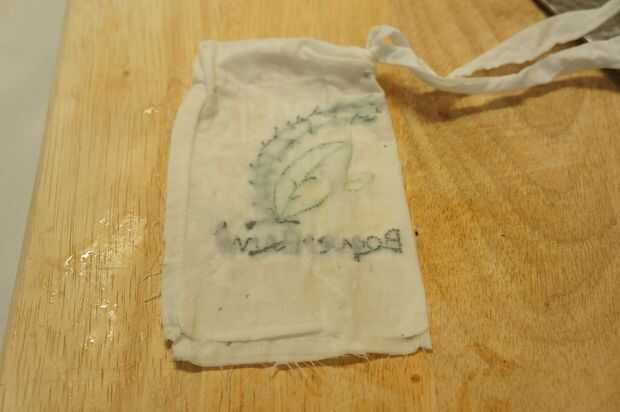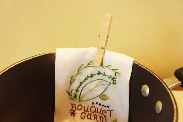 Boquet Garni se utilizan para condimentar sopas claras, las existencias y salsas sin tener que colar el caldo. Si no desea utilizar la cadena de drenaje podría doblar la parte superior de la bolsa y usar una pinza para la ropa como en la foto. Después de quitar las bolsas de valores; las hierbas se vacían y la bolsa se enjuaga bien y línea seca hasta el próximo uso.
