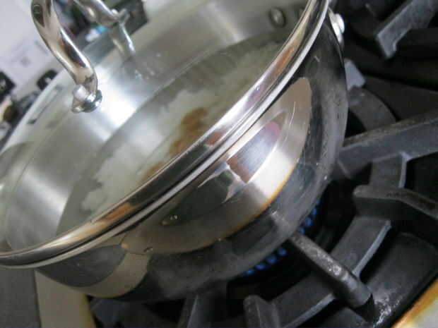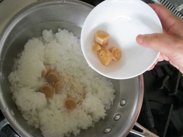 Ahora volcado en sus vieiras secas, agua y todo, con la mezcla de arroz y agua. ¿Por qué? Porque el no quiere perder la esencia que yummy vieiras que se infunde en el agua de remojo. Tapar y cocinar sobre fuego medio hasta que hierva.