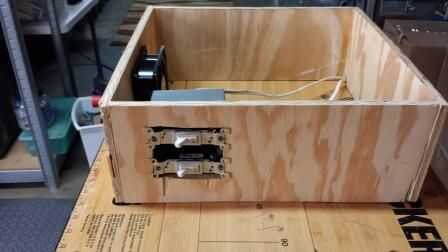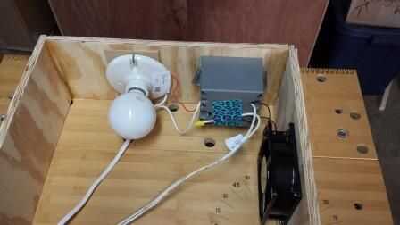 Montar el ventilador, interruptores de luz y sostenedor de la lámpara a los lados de la caja. Corte las puntas del receptáculo de los cables a utilizar como cables de alimentación de mi. Conecte el ventilador a un interruptor. No tengo que usar un transformador ya que he podido encontrar un ventilador de la CA de 120v. Cable del lámpara soporte y cable de alimentación a otro interruptor de la luz. Añadir una bombilla. Las conexiones de prueba.