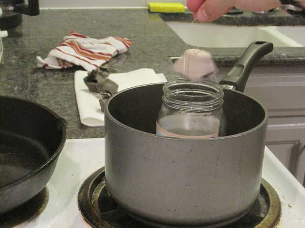 Apagar la hornilla, ahora puede bajar los starters de fuego en la jarra o lata de cera derretida usando el trozo de hilo dental. Asegúrese de que los starters de fuego son completamente sumergidos hasta la parada de burbujas subiendo a la superficie. Nota: puede ser de ayuda utilizar un utensilio adicional para empujar por debajo de la línea de cera.