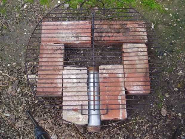 Esta capa también llevará a cabo la parrilla de fuego. La cámara de combustión se encuentra por encima de la cámara de aire y la parrilla solía sostener el carbón de leña en el ritmo. Mi parrilla tenía un soporte de alambrón corriendo por el centro para que pueda ver cómo utilicé el hueco creado por la tubería y la diferencia entre los dos ladrillos en la parte posterior que pone plano y no conseguir doblada por el peso de los ladrillos de arriba. Usé una parrilla grande suficiente para que el cable externo de barra de apoyo de no impacto la fragua. Todo usado en la fragua debe devolver más o menos para su propósito original.