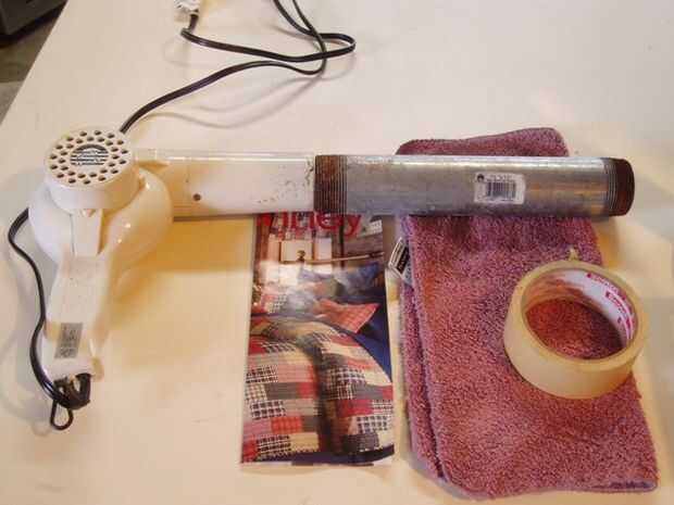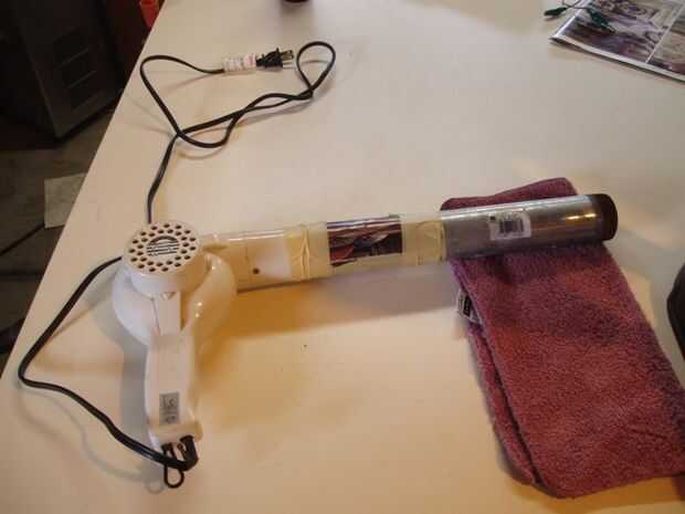 Tomar una página del catálogo o revista y dóblalo en mitades o tercios hasta que se forme una tira un par de pulgadas de ancho. Esto se utilizará para conectar el tubo con el secador sin una conexión física. Reduce posibilidades de transferencia de calor. Además el libro sirve como un indicador temprano de advertencia si el calor es presenct, entonces se puede apagar el secador del soplo y la Asamblea extraído el calor para seguridad.
