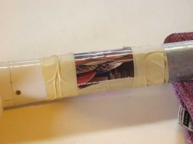 Pegue una tira firmemente entre los dos tubos (secador y pipa, véase el cuadro). Envolver la tira firmemente alrededor de la articulación varias veces y luego cinta adhesiva firmemente en los extremos. El tubo de papel ahora forma una articulación sorprendentemente fuerte entre los dos dispositivos para crear un solo aparato.
