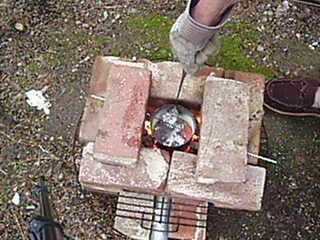 Una vez que tengas un buen crisol de metal fundido plateado (más o menos) retirar los ladrillos de la dos chimenea desde la parte superior del horno. Enganche la varilla del crisol con el gancho de la percha y levante el crisol del horno. Inclinar el crisol para verter el aluminio usando la pieza de madera para levantar la parte inferior (ver foto), este enfoque proporciona muy buen control en el vertido.