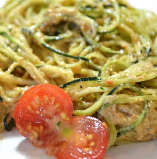 Combine todos los ingredientes (excepto el calabacín y aceite de oliva) en la licuadora. Que mezcla unos 4 minutos para calentar mientras preparaba fideos de calabacín.