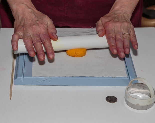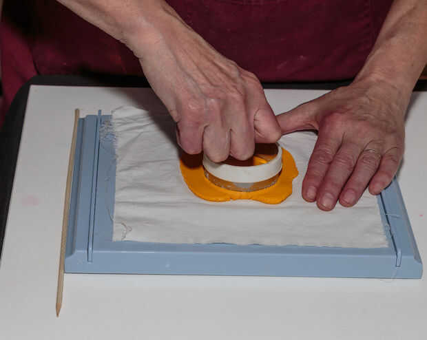 Condición de la arcilla amarilla en tus manos amasando y rociar ligeramente con agua si está seco. Debe ser suave y flexible cuando haya terminado. Use una escuadra designada de algodón laminado para cada color de la arcilla. Estirar una losa gruesa de 3/16" de arcilla amarilla con kit de balanceo del producto ACTÍVA y corte un 1 ¾"círculo hacia fuera. Ponga a un lado.