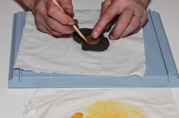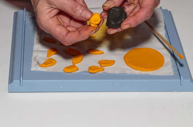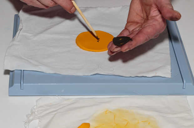 Condición de la arcilla negra añadiendo una pequeña cantidad de arcilla amarilla hasta obtener el color deseado para hacer la oscuridad de su girasol. Con un algodón designado láminas de la arcilla oscura, rodar hacia fuera una losa de 3/16" de espesor y cortar un círculo del tamaño de un cuarto. Rayar o marcar la parte posterior de este círculo oscuro y marcar el círculo de 1 3/4" amarillo con un pincho de madera ligeramente humedecer cada zona y el circulo oscuro en el centro del círculo amarillo. Textura del círculo oscuro con un lápiz opaco para que aparezca tener semillas. Este es el comienzo de su girasol.