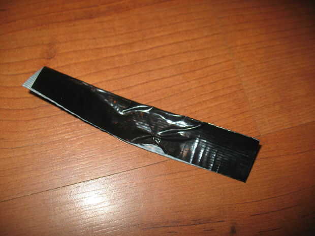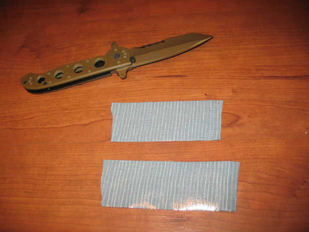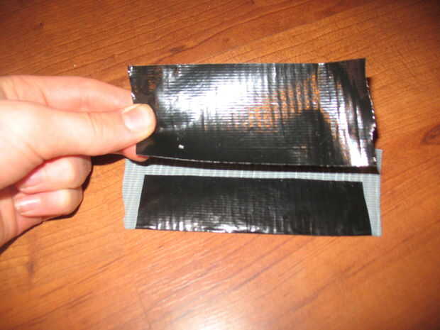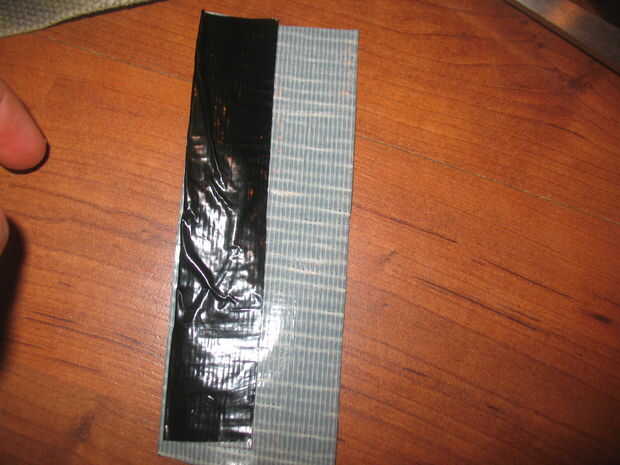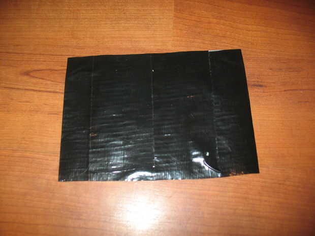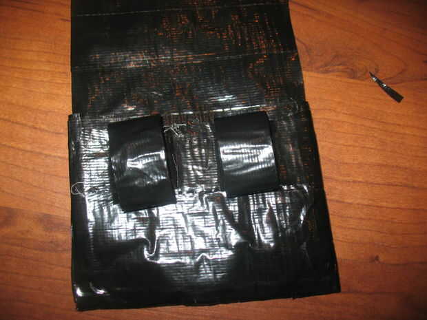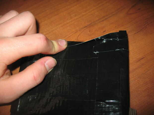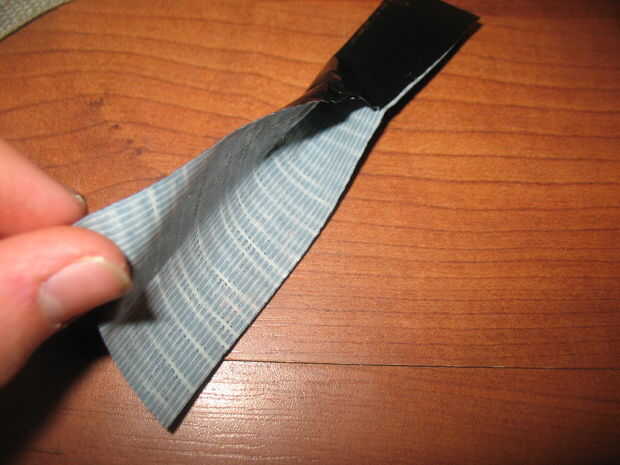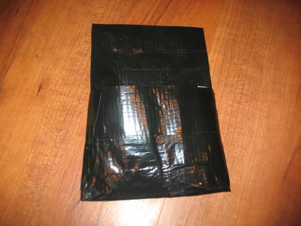 Lop off two sections of tape 4 1/2" long. Llame a una pieza "A" y otro "B". Coloque un lado pegajoso hacia arriba sobre la mesa y coloque el lado pegajoso de B abajo a medio camino encima de A. Doble la mitad expuesta de un sobre y presione hacia abajo. Tire el upand todo lo pone así la mitad de B es lado pegajoso hacia arriba. Corte otro 4 1/2" pieza y ponlo lado pegajoso hacia abajo en la parte pegajosa del B. Tire hacia arriba y comience otra vez. Eventualmente pueda recibir la parte no-pegajosa es 4 1/2" alto. Cuando esto sucede, doble la parte pegajosa hacia abajo para acabar con. Recortar los bordes para que la anchura es 4". Ahora están a medio camino hecho! Hacer otra hoja, esta vez haciéndolo 6 3/4" de alto por 4 1/2". No corte la anchura de este tiempo. Una vez terminados ambas hojas, con cinta adhesiva el extra 1/4" largo y grabar abajo. Hace un par de presillas cortar lo suficiente para ir alrededor de su cinturón de elección más de una vez. Doblar por la mitad para cubrir los lados pegajosos. Reforzar la franja con más trozos de cinta. Una vez que esté satisfecho, haga un bucle de grabación juntos. Cinta adhesiva en su bolsa. Puede agregar cualquier tipo de sujetador que desea.