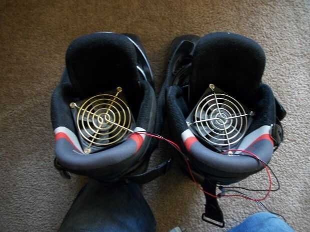 Bueno, mi experiencia me ha enseñado que flujo de aire va a hacer mucho más para evaporar agua que calor. Así, para obtener las botas tan secas como sea posible, use aire forzado un poco en vez de calor. La mejor manera de lograrlo es tomar sólo un par de ventiladores y un viejo adaptador de CA que salidas de 12 voltios.
