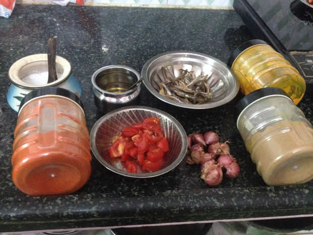 Seco pescado frito (karuvaadu fría) (1 / 6 paso)