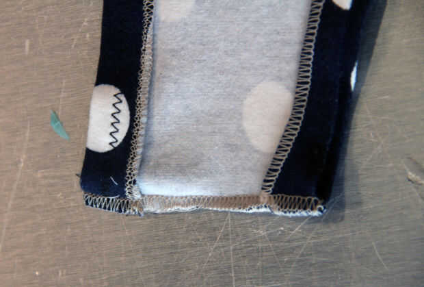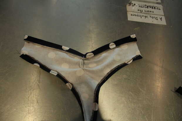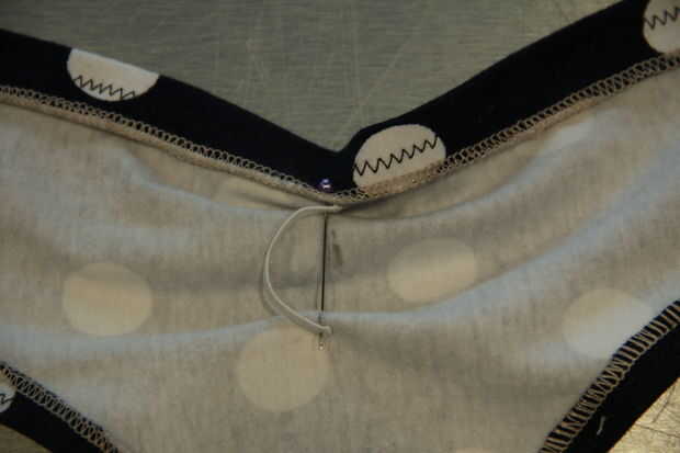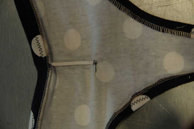 Coser uno de los extremos del elástico en el borde del centro superior de las bragas donde el perno es marca sew(see image). Coser el otro extremo a lo largo de la línea central pero 2.5" luego bajo el otro borde. Desde 2.5" es más largo que el elástico se manojo de su ropa interior de tela (esto es lo que queremos!)