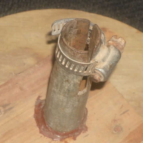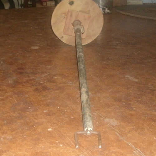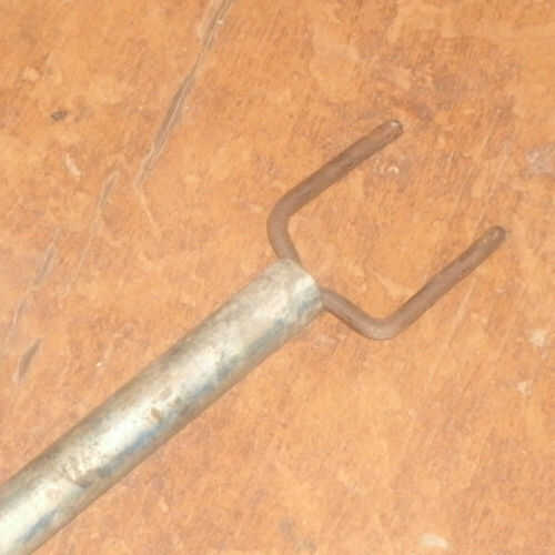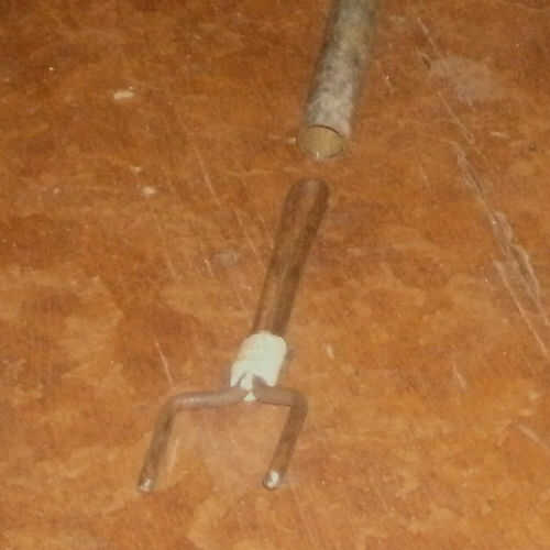 Necesitaba algo parecido a un tenedor en la parte inferior de la tubería para bloquear en el marco de la silla y facilitar el retiro de la estructura. Para hacer eso, dobló un pedazo de varilla 1/4"(martillo, tornillo de banco y alicates) para hacer la bifurcación. La "manija" de la horquilla se ajusta dentro de la pipa central de la tabla. Para hacer un ajuste apretado un poco, envuelve la horquilla, con alguna cadena y cinta para conseguir el diámetro adecuado y sólo tiene que pulsar lo montado en el extremo de la tubería.