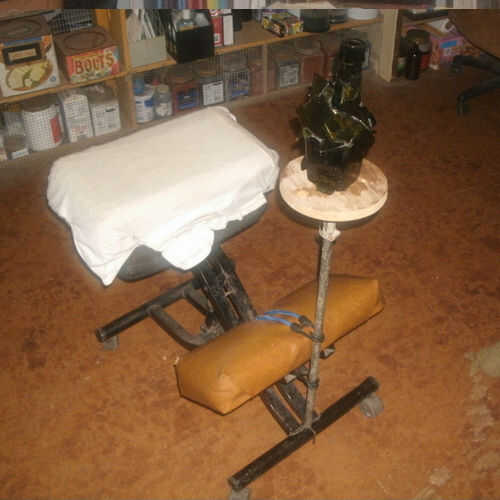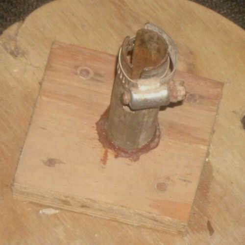 La mesa es un trozo redondo de madera contrachapada, con una pieza cuadrada debajo. La pieza cuadrada tiene un cómodo agujero redondo perforado en él (taladro ayuda a mantener el agujero a 90 grados) para el tubo de metal que encajan con el pegamento. Un pedazo de tubería metálica EMT de 3/4" con tres" dedos: "cortar el final de la misma y una abrazadera de la manguera completa la tapa de tabla. Con la abrazadera de la manguera suelta, la tabla gira. Con lo apretado, no giran tan fácilmente (sólo si las cuerdas del amortiguador auxiliar dejó el tubo central de 1/2" EMT spin).