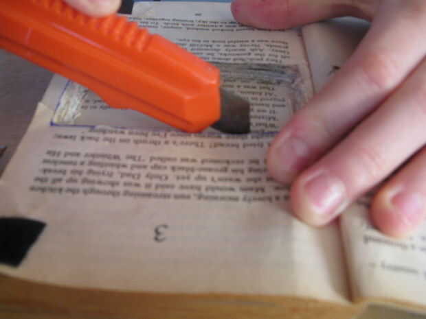Ahora cortar los agujeros en las páginas fueron el ipod va a sentarse. Asegúrese de que haces lo suficientemente profundo para adaptarse a tu ipod la cubierta caben sobre ella.