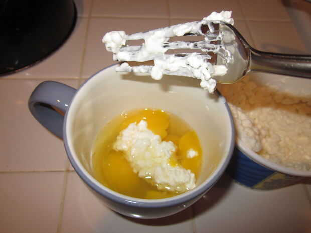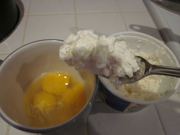 Utilice un tenedor para agregar aproximadamente 1/4 taza de queso cottage al recipiente con los huevos.