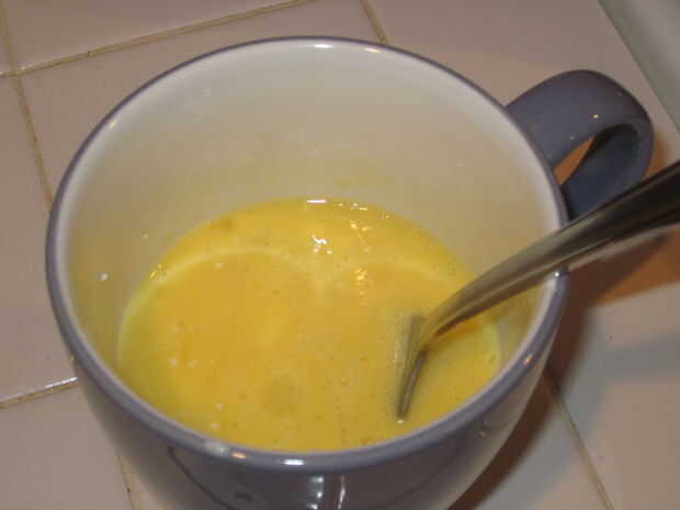 Huevos de mezcla con un tenedor (o batir) hasta que la mezcla es un color amarillo uniforme.