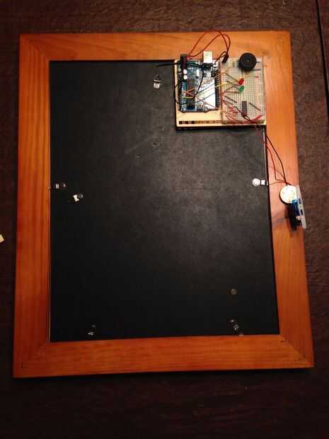 Fui a CA Moore para comprar el marco para mi pared. Escoge la imagen que desee de antemano, porque no va a ser divertido para cambiar luego. Una vez que tenga su foto y su marco, cortar una pieza fina de contrachapado que es del mismo tamaño del marco, utilicé un cuarto de pulgada de grosor, y os adjunto esta en la parte trasera del bastidor con tornillos por lo que podría salir. No hay ninguna imagen de este, pero cubre tanto la parte de negra y marrón. Ahora, si tu marco es otra cosa que madera, no dude lo de epoxy, o pegamento o lo que sea. Recuerde que la imagen no se puede cambiar después de eso. Después de esto, os adjunto el arduino a la madera contrachapada y lo mismo con la placa. La unidad piezoeléctrica, si lo desea, puede conectarse cables más largo por lo que toca la madera, sino que depende de usted. Yo no hice eso. El motor puede sujetarse al borde, como se ve en la foto, porque tiene que abrir un cerrojo. Usé un servo que fue modificado, como recomiendan, porque un brazo se puede conectar fácilmente, pero si se utilizó un motor de corriente continua, un brazo se puede poner en demasiado. Utilicé un cuadrado de taladro para perforar el área para el servo en el marco y la madera contrachapada, y luego pegué el motor. Cualquiera que sea el caso con el motor es, cuando está bloqueado, el brazo debe estar apuntando hacia el exterior del marco (que se cernían sobre el borde) y cuando abrió, debería pivotar en. Dicho esto, el marco se hace ahora.