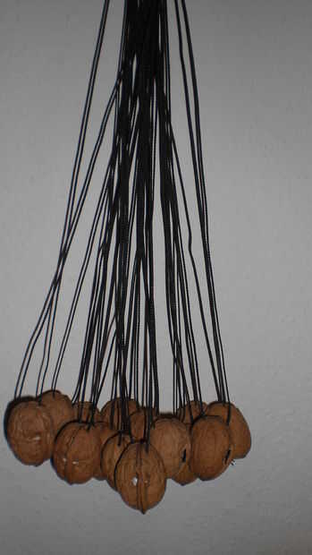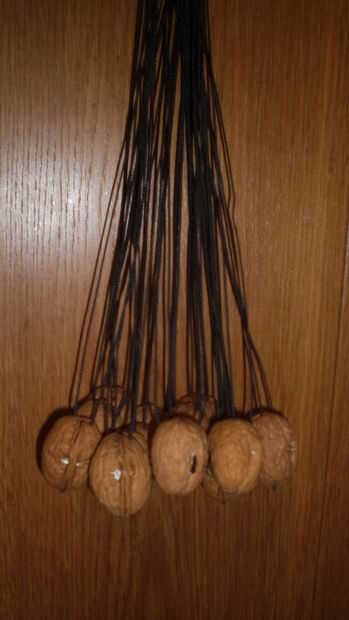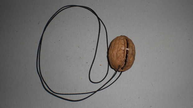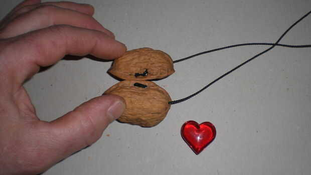 A través del otro orificio puede pulsa una parte de la toothstick de madera y fijarlo a un lado con una pequeña gota de pegamento para madera. Después de algunos minutos usted puede cortar el resto de la toothstick de ambos lados de la nuez tan sólo una muy pequeña parte queda y funciona como una cerradura.