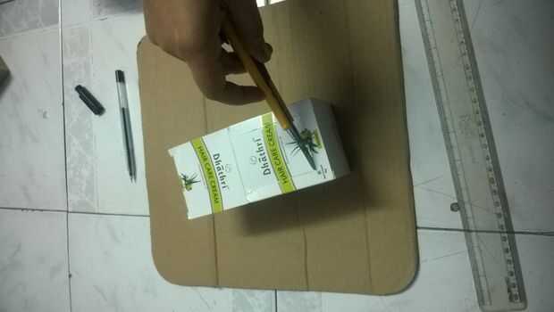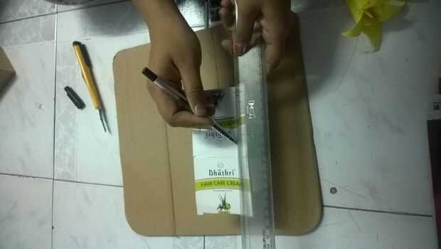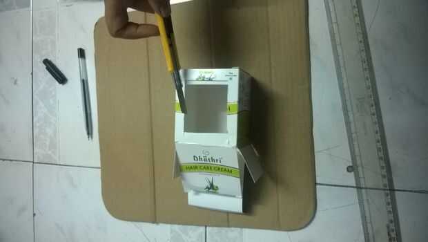 > ahora, utilice un cortador de papel y la regla para cortar un lado de la caja que será el agujero (cuadrado/rectangular según la caja) en el que colocaremos las flores.