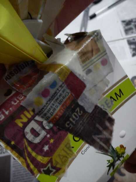 > / cubierta de la caja entera con los pedacitos de periódico humedecido en pegamento. Asegúrese de que la aleta no está pegada a la caja, tenemos que abrir y poner a nuestro tesoro.