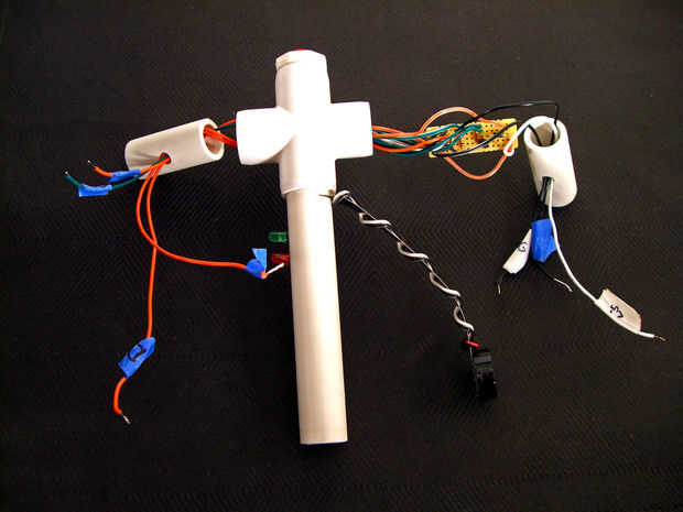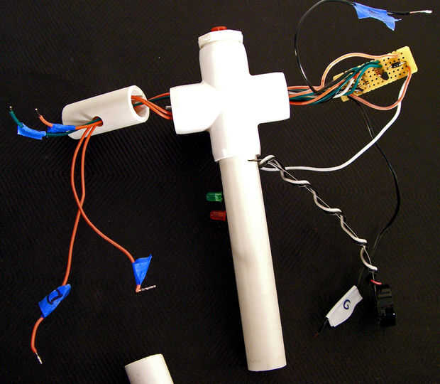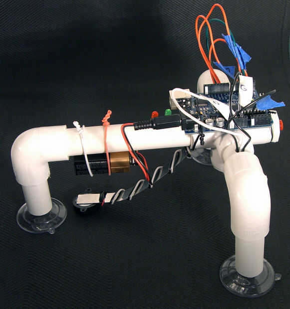 El circuito debe ser la primera parte puso en lugar interior de la tubería para el subproceso de brazo tablero los cables por tierra, + 5v y, análoga 0 a través del pequeño orificio en la parte superior del brazo.