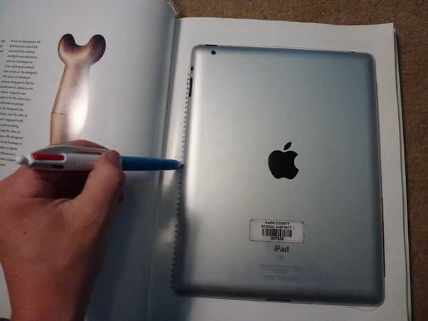 Una vez que el pegamento se haya secado, abrir el libro. La sección de pegado debe permanecer juntos como una sola página gigante. Si no, repita paso 3. Levante su Ipad y puso el rostro hacia abajo en el centro de la sección de pegado. El Ipad debe tener por lo menos media pulgada de página a cada lado del mismo. A continuación, trace una línea alrededor del Ipad con el lápiz. El Ipad de lado y recoger el cuchillo y regla. Sostenga la regla a lo largo de una línea de trazado y corte en la línea, utilizando la regla para guiar el cuchillo. Repita en los otros lados del trazado. Eliminar la square(s) que ha cortado, entonces repita el proceso en la página siguiente, esta vez utilizando cortes anteriores como una plantilla. Seguir cortando los cuadrados hasta llegar a la cubierta posterior del libro.