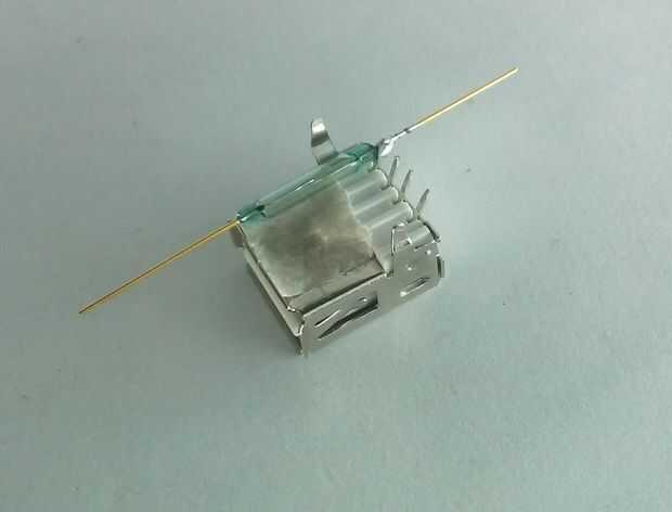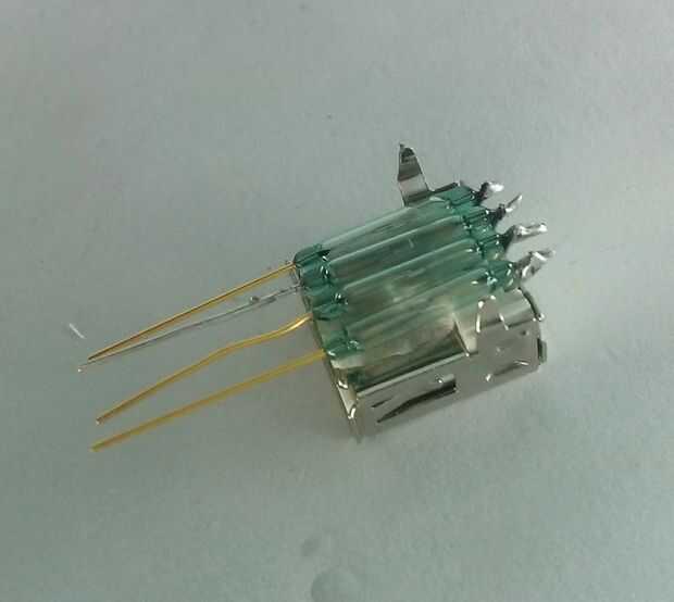 Luego soldar el interruptor de láminas a cada pin. Yo realmente cuidado, estos interruptores reed están hechos de vidrio muy muy fina que odio tanto. se quiebren fácilmente y son bastante caros eso si tener cuidado.